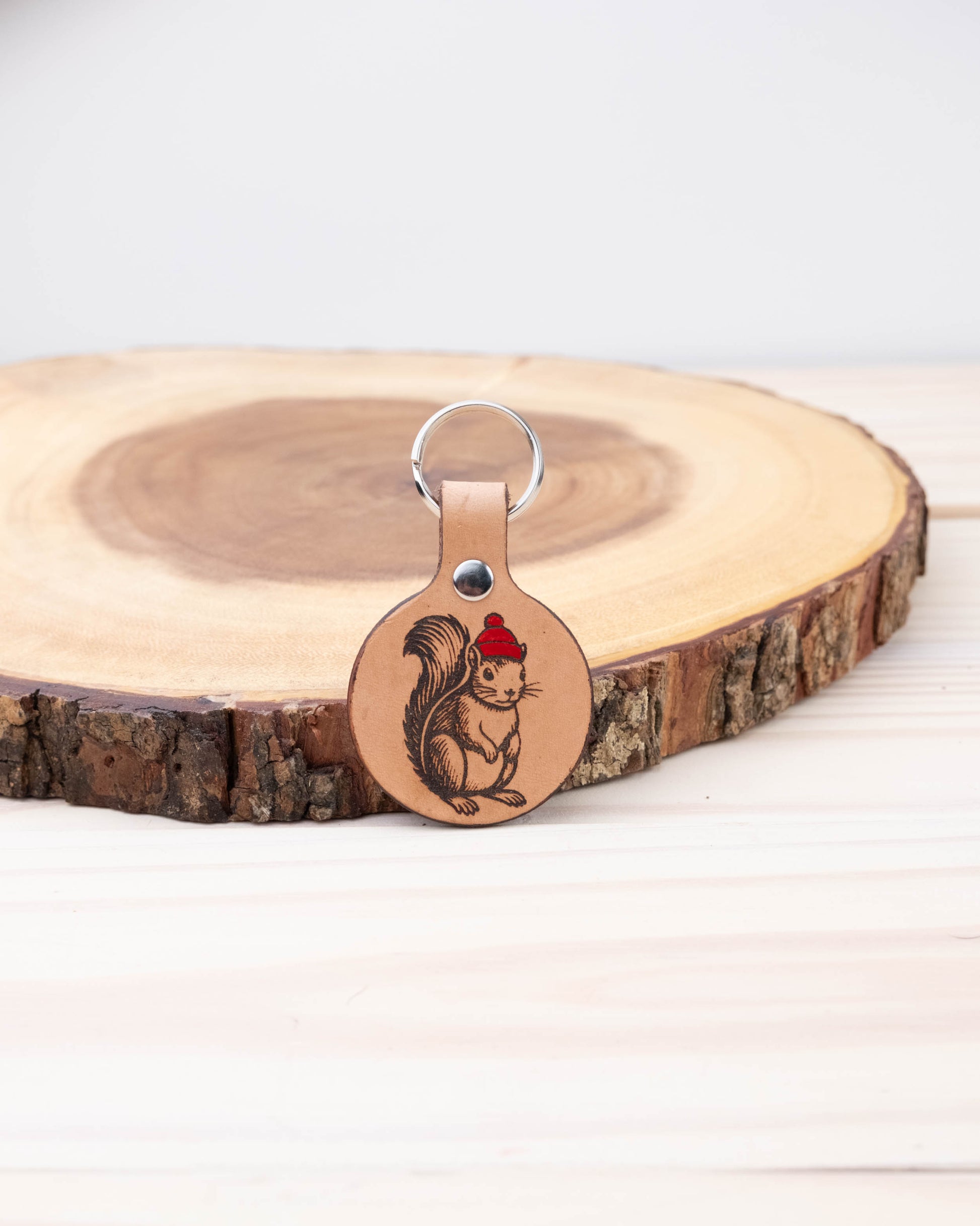 Squirrel! Did someone say squirrel?? Our leather tags are crafted from premium vegetable-tanned leather. With a squirrel in a red cap on the front and all of your dog's (or cat's) vital information, ensuring they're never lost on their adventures. Durable enough to withstand wilderness expeditions yet stylish for urban explorations, this tag ages beautifully with every tail-wagging, syrup-drinking, timbit-eating quest.